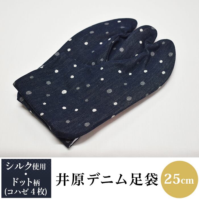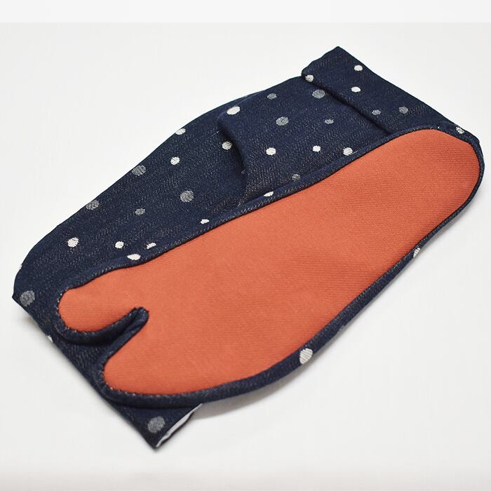 不揃いなサイズ感でドット柄を表現しているかわいい足袋。なんといってもこの生地にはシルクが入っており、デニムとは思えない優しい風合いが味わえます。
