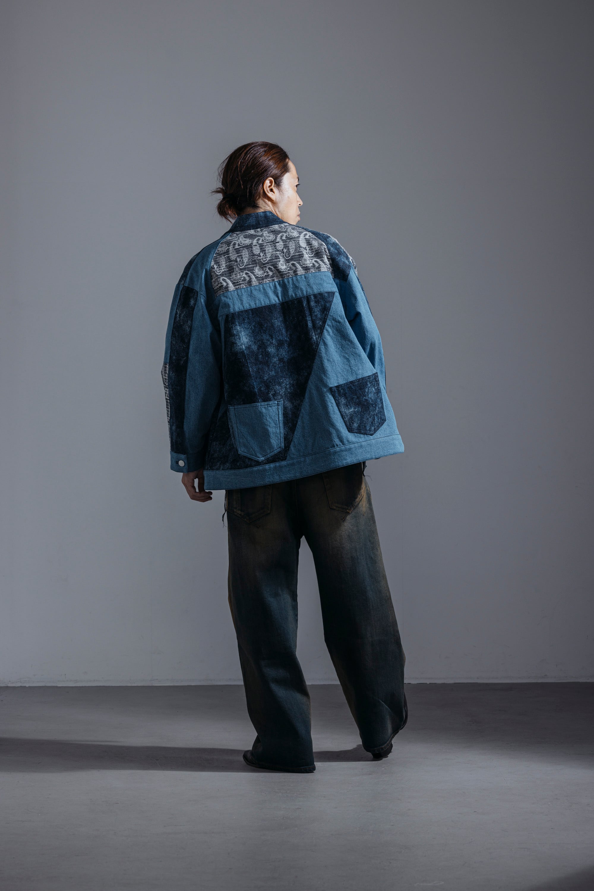 デニムとジャガード生地を絶妙なバランスで切り替えを施した存在感あるパッチワークジャケット。